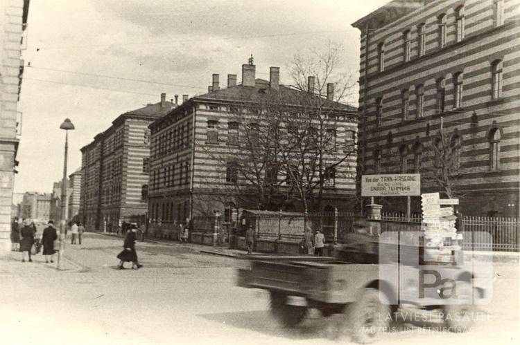 Ielas skats uz vairākstāvu mūra ēkām pārvietoto personu nometnē "von der Tann-Kaserne" Rēgensburgā (amerikāņu zonā) ap 1948. gadu. Nometne atrodas aiz žoga, teritorijas stūrī ir liela zīme. Priekšplānā brauc automašīna, pa bruģētu ielu pastaigājas cilvēki, abpus ielai ir vairākstāvu mūra celtnes.