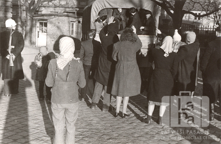 Ļaužu grupa atsveicinās no cilvēkiem smagās kravas mašīnas aizmugurē Rēgensburgas nometnē (amerikāņu zonā). Kreisajā pusē stāv nometnes policists ķiverē un ar šauteni aiz muguras. Kreisajā pusē ir redzama neliela ķieģeļu ēka.