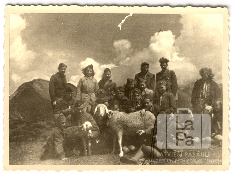 Skauti un gaidas no Rēgensburgas nometnes (amerikāņu zonā) izbraukumā ap 1948. gadu. Jauniešu grupas priekšā ir viena aita, divi jēriņi ir skautiem klēpī. Fonā lieli kalni un mākoņainas debesis.