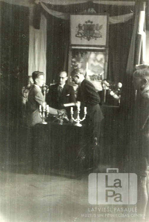 Jaunietis dod roku kungam uzvalkā, priekšā apklāts galds ar svečturiem, uz sienas ai viņiem ierāmēts Latvijas ģērbonis un glezna no Brīvības pieminekļa, labajā pusē puisis stāv ar Latvijas karogu.