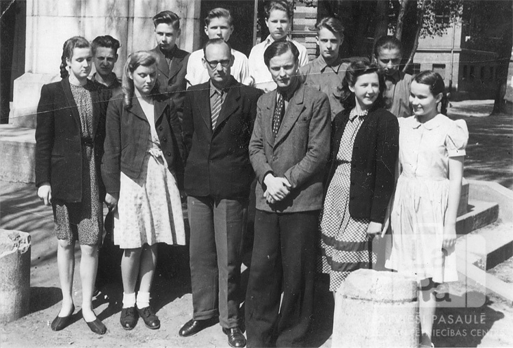 Tālavas tautskolas 7. klases skolēni Rēgensburgas nometnē (amerikāņu zonā) stāv ārpus skolas pie pieminekļa. Priekšējā rindā stāv meitenes un vidū divi vīrieši uzvalkos, aizmugurējā rindā stāv zēni. Fonā mūra ēkas. Priekšējā rindā, no kreisās: ? Muižniece, nezināms, ? Agrums (skolas pārzinis), V. Aldiņš (klases audzinātājs), Ilga Cīrule, nezināms. Aizmugurē, no kreisās: I. Ezernieks, ? Kalniņš, J. Sīlis, T. Baltakmens, I. Pārums, T. Zāgerts.