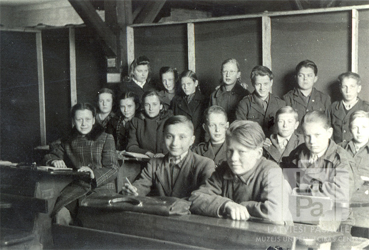 6. klases audzēkņi Tālavas tautskolā Rēgensburgas nometnē (amerikāņu zonā). Priekšā skolēni sēž solos, aizmugurē skolēni stāv gar sienu. Bērniem mugurā ir mēteļi. Priekšējā solā, no kreisās: Tālrīts Zāgerts, Imants Jansons. Pārējos solos ir redzami: ? Muižniece, Lija Legzdiņa, Ivars Pārums, Jānis Skujiņš, Tālivaldis Baltakmens, Agris Strautmanis. Aizmugurē ir redzami: Ilga Cīrule, Taisa Lendiņa, Velta Koškina, Jānis Ruiga, Edvards Drobiševskis, Laimonis Blāķis.