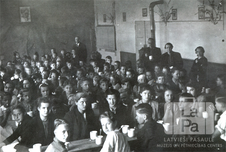 Skolēni sēž pie gariem galdiem ēdienreizes laikā Tālavas tautskolā Rēgensburgas nometnē (amerikāņu zonā). Katram skolēnam ir priekšā sava krūze, gar malām stāv audzinātāji. Labajā pusē pie sienas ir krāsns ar dūmvadu. Priekšplānā, no kreisās: pirmais Ivars Pārums, otrais T. Baltakmens, trešais ? Kalniņš, ceturtais T. Zāgerts, piektais G. Zoliņš. Telpā vēl ir redzami skolēni: ? Muižniece, I. Cīrule, I. Ķauķe, ? Ezernieks, ? Kovaļūna. Telpas galā stāv: ? Mūrnieks. Labajā pusē pie krāsns ar krūzi rokās stāv: ? Agrums (skolas pārzinis).