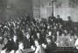 Bērni sēž pie gariem galdiem lielā telpā, katram sava krūze priekšā, gar malām stāv audzinātāji, labajā pusē krāsns
