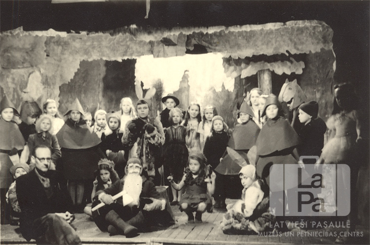 Skolēni teātra uzvedumā uz izdekorētas skatuves Tālavas tautskolā, Rēgensburgas nometnē (amerikāņu zonā). Visi bērni ir ģērbušies kostīmos (zaķi, rūķi, laumiņas). Kreisajā pusē, priekšplānā, uz krēsla sēž vīrietis bez kostīma: ? Agrums (skolas pārzinis). Uz skatuves ir redzami: Edīte Pāruma, Agris Strautmanis, Kārlis Pārums.