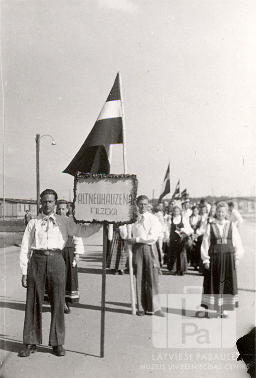 Gājiens, cilvēki tautas tērpos stāv, priekšā vīrietis ar plakātu kur ir rakstīts: "ALTENHAUSEN/FILZEKA", aiz viniem vīrietis nes Latvijas karogu