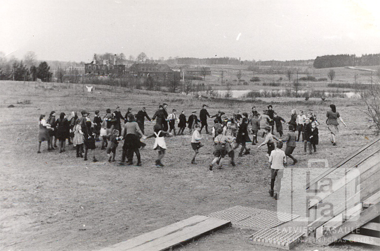 Par šo gadījumu Ivars Pārums atceras: "Skolēni rotaļās skolas priekšā. Aizmugurē redzama divstāvu betona ēka. Tādas bija izkaisītas gar meža malu un lietotas kā dīpīšu dzīvojamās telpas."
