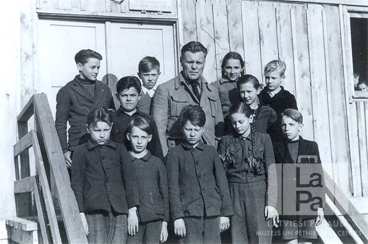 4. klases skolēni ar klases audzinātāju stāv uz koka trepēm skolas barakas priekšā Filzekas nometnē (amerikāņu zonā). Priekšā, no kreisās: Aivars Eidiņš, Ivars Pārums, Imants Jansons, Taisa Lendiņa, Laimonis Blāķis. Aizmugurē, no kreisās: Jānis Ruiga, Edvards Drobiševskis, Jānis Skujiņš, ? Asars (klases audzinātājs), Lija Legzdiņa, Ilga Cīrule un Edgars Kristlībs.
