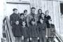 Bērni divās rindās uz koka trepēm pie koka barakas, vidū vīrietis uzvalkā