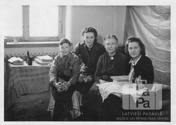 Šeibeļu ģimene ar ciemiņu sēž savā istabas stūrī Ziemeļu nometnē Vircburgā (angļu zonā). Telpas kreisajā pusē loga priekšā ir koka kaste, kas ir izmantota kā galds un apsegta ar galdautu. Labajā pusē ir redzams telpu atdalošs plastmasas (?) aizkars. Priekšplānā, labajā pusē, ir mazs galds ar grāmatām, nelielu stikla pudeli un mazu Latvijas valsts karogu. No kreisās: Ivars Šeibelis, Māra Šeibelis, Marta Baltkājs, Inese Pepulis. Foto autors: Teodors Kauls sen.