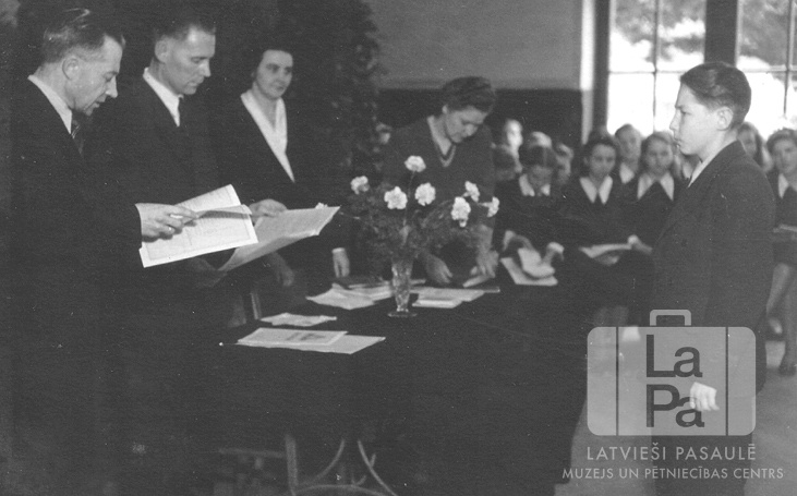 Ivars Šeibelis saņem pamatskolas beigšanas apliecību Centrālajā nometnē Vircburgā (angļu zonā). Kreisajā pusē aiz galda stāv skolotāji, diviem no viņiem rokās ir dokumenti. Uz galda ir dokumenti un puķes vāzēs. Labajā pusē, priekšplānā stāv Ivars Šeibelis, viņam aizmugurē, fonā, sēž citi pamatskolas absolventi. Priekšplānā, kreisajā pusē, no kreisās: nezināms, Jēkabs Pļaviņš (skolas direktors), ? Bolis (7.B klases audzinātāja) un ? Cīrulis (7.A klases audzinātāja). Foto autors: Teodors Kauls sen.