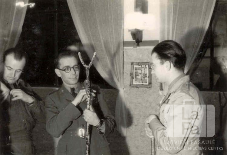 Starptautiskā skautu biroja pārvietoto personu skautu ceļojošais inspektors Žans Mone ar latviešu roveru īkšķa nūju Hānavā (amerikāņu zonā). Viņam blakus stāv divi citi vīrieši, visi ir ģērbušies skautu formastērpos. Fonā ir divi telpas logi.