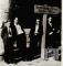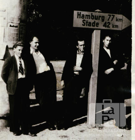 Četri jauni vīrieši uzvalkos stāv pie koka ceļa zīmes Zēdorfā (angļu zonā). Uz zīmes ir rakstīts "Hamburg 77km/ Stade 42 km". No kreisās: Jānis Kalniņš, Alfreds Filks, Bernards Jēkabsons, Roberts Linejs.