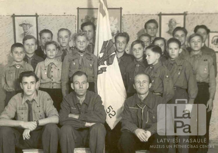 Tērvetes 52. skautu vienības skautu pulks ar saviem vadītājiem un vienības karogu mītnē Ausmas nometnē Kleinkecā (amerikāņu zonā). Zēni un vīrieši ir ģērbušies skautu formastērpos. Karogs ir gaišs, ar tumšu zīmējumu vidū. Karoga stūrī ir cipars "52". Fonā, uz sienas, ir vairāki zīmēti portreti ar skautu cepurēm. Pirmajā rindā, no kreisās: otrais Žanis Ķesteris (vadītājs), trešais Jānis Mazītis (vadītājs).