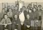 Zēni formas tērpos ap vienības karogu. Priekšā sēž vadītāji.
