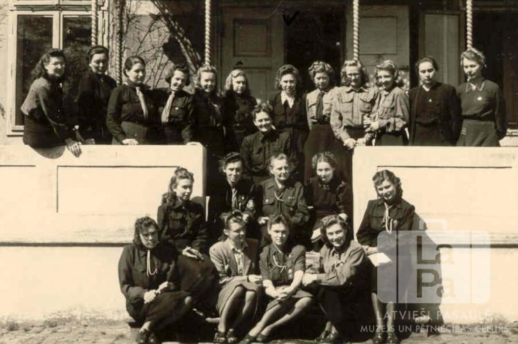 Gaidu vadītāju grupa ziemeļu apgabala gaidu vadītāju sanāksmes/konferences laikā Eitīnes nometnē (angļu zonā). Sievietes ir ģērbušās formastērpos, stāv uz trepēm ēkas priekšā. Otrajā rindā, trešā no kreisās (rindas vidū): Elza Lauferte (vadītāja). Pēdējā rindā, septītā no kreisās puses: Erika Kalniņa (Daugavas 2. gaidu vienības Švarcenbekā vadītāja).