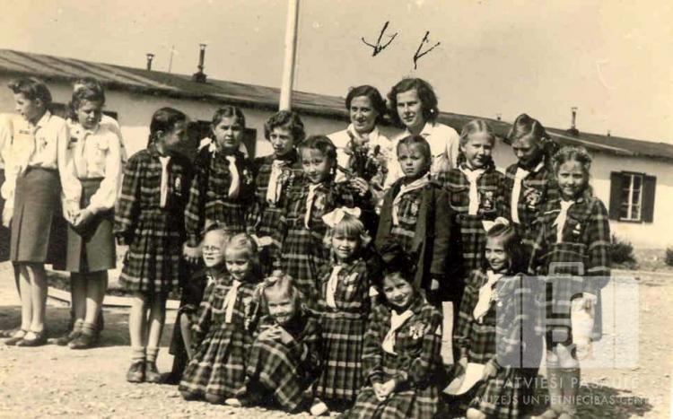 Tērvetes 42. gaidu vienības guntiņu grupa ar savām vadītājām Ausmas nometnē Kleinkecā (amerikāņu zonā). Priekšā meitenes stāv svītrainos formastērpos, aizmugurē vadītājas stāv gaišā apģērbā, viena tur rokā ziedus. Aiz grupas ir vienstāvu barakas. Grupai kreisajā pusē stāv Tērvetes 42. gaidu vienības gaidu grupa gaišos formastērpos. Aizmugurē, no kreisās: Milda Cerbule (vadītāja) un Austra Salkalne (vadītājas vietniece).
