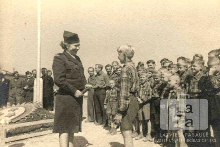 Sieviete militārā formā sarunājās ar zēnu formās tērpā. Aizmugurē pieaugušie un zēni formas tērpos - ierindā. Vidū DP nometnes karogmasts