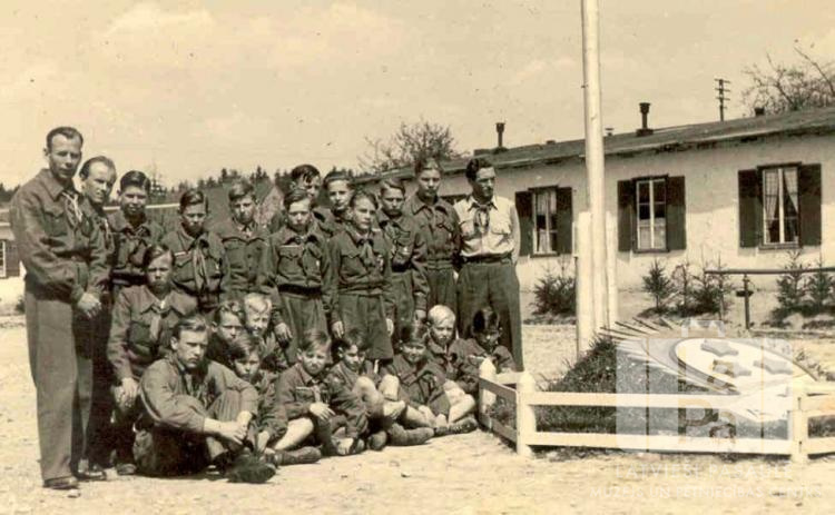 Tērvetes 52. skautu vienības skautu pulks ar saviem vadītājiem pie galvenā karogmasta Ausmas nometnē Kleinkecā (amerikāņu zonā) 1946. gada vasarā. Visi ir ģērbušies skautu formastērpos. Labajā pusē uz neliela zemes paaugstinājuma ir redzama ģerboņa daļa (trīs zvaigznes), kā arī karoga masts. Fonā ir nometnes vienstāvu barakas.