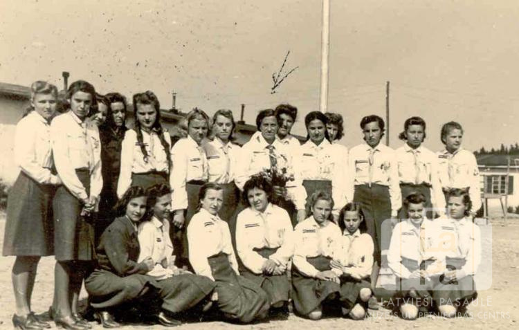 Tērvetes 42. gaidu vienības gaidu grupa formastērpos Ausmas nometnē Kleinkecā (amerikāņu zonā) 1947. gada vasarā. Fonā karoga masts un vienstāvu barakas. Otrajā rindā, astotā no kreisās (zem bultas): Milda Cerbule (vienības priekšniece, vadītāja).