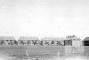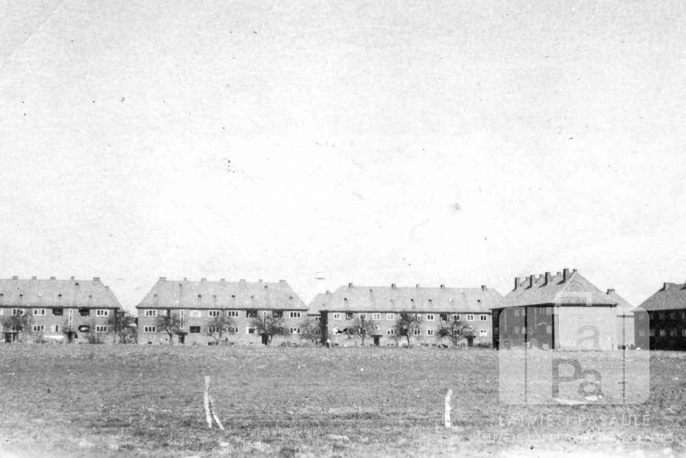 Skats uz plašu lauku un vairākstāvu mūra dzīvojamajām ēkām Glikštates nometnē (angļu zonā) 1946. gada pavasarī. Gar mājām stiepjas nelielu koku rinda bez lapām.