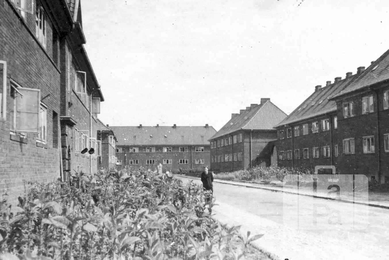 Iela ar divstāvu dzīvojamajām ēkām Glikštates nometnē (angļu zonā). Pa ietvi pastaigājas vīrietis, daudzi ēku logi ir atvērti. Vairākām ēkām priekšā ir dārzi ar tabakas augiem. Par šo gadījumu Jānis Šics atceras: "Šicu ģimenes ēka ir kreisā pusē ar tabakas dārziņu priekšā. Tabakas audzināšana bija izdevīga, jo par to no vāciešiem varēja iegādāties papildu pārtiku."