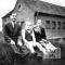 Ģimene (tēvs, māte un divi puisīši) sēž uz pakalniņa, ēka fonā
