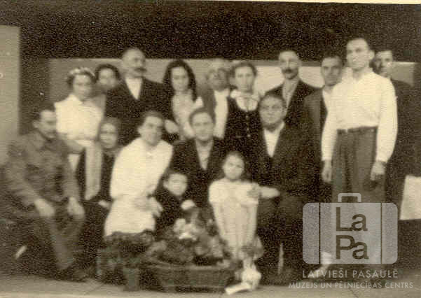 Latviešu teātra grupa Laufenrautenbahā (amerikāņu zonā). Cilvēki sēž un stāv vairākās rindās, priekšā grozs ar ziediem (?). Ceturtais no labās puses: Jānis Lielkājis (stāv, ar ūsām).