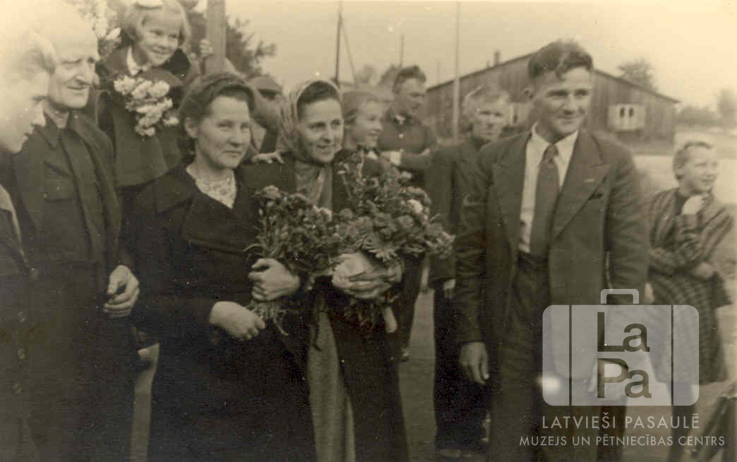 Cilvēku grupa, atvadoties Valkas nometnē Nirnbergā (amerikāņu zonā). Divām sievietēm un meitenei kreisajā pusē rokās ir ziedi. Fonā, labajā pusē, ir vienstāvu koka ēka. Priekšplānā, vidū: Kārlis Ieleja ar kundzi. Par šo gadījumu Jānis un Regīna Lielkāji atceras: "Patīkama sajūta, uzdodot dīpīšu dzīvi un ceļā uz jaunu dzīvi."