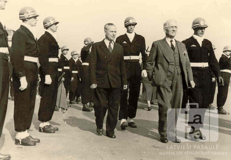 Latvijas Republikas sūtnis Lielbritānijā apmeklē amerikāņu melno vienības latviešu Viestura rotu Štutgartē (amerikāņu zonā). Apkārt ierindā stāv vīri melnos formastērpos un gaišās ķiverēs, vidū ir divi vīri uzvalkos. Priekšplānā, no labās: pirmais Jānis Lielkājis (rotas komandieris kapteinis), otrais Kārlis Zariņš (sūtnis, gaišā uzvalkā) un trešais ? Skaistlauks (adjutants leitnants).