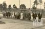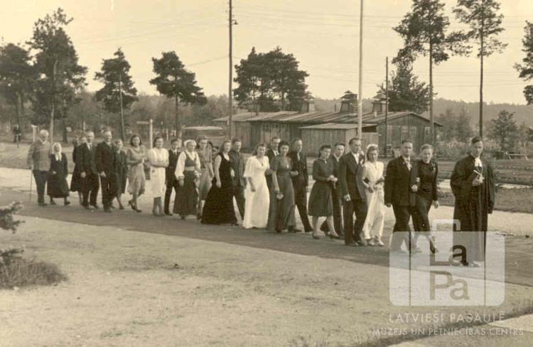 Kāzu gājiens Valkas nometnē Nirnbergā (amerikāņu zonā). Gājiena priekšgalā iet mācītājs, aiz viņa vairākās rindās kāzu gājiena dalībnieki. Fonā atsevišķi augošas priedes un vienstāvu koka baraka. Gājiena priekšgalā, pirmais: Hermanis Treijs (mācītāja tērpā). Aiz viņa soļo: ? Klungste un ? Klungsts (vedēju pāris). Trešajā rindā, otrā no kreisās: Gunta Bērziņa (līgava). Ceturtajā rindā, no kreisās: Regīna Lielkāje, Jānis Lielkājis. Par šo gadījumu Jānis un Regīna Lielkāji atceras: "DP nometnēs latvieši vēl vienmēr piekopa tradicionālos kāzu gājienus."