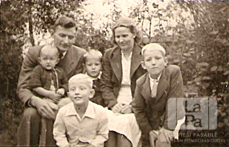 Liepiņu ģimenes portrets Volterdingenē (angļu zonā). Tēvs, māte un četri bērni. Fonā krūmājs. Priekšā, no kreisās: Rūdolfs Liepiņš, Olģerts Liepiņš. Aizmugurē sēž, no kreisās: Jānis Liepiņš, Lauma Liepiņa (sēž tēvam klēpī); Jānis V. Liepiņš un Vallija Liepiņa.