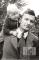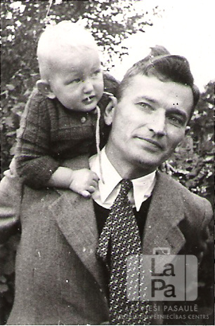Jānis Liepiņš ar meitu Laumu Volterdingenē (angļu zonā). Vīrietis ir ģērbies uzvalkā, meita viņam sēž uz pleca. Fonā koki.