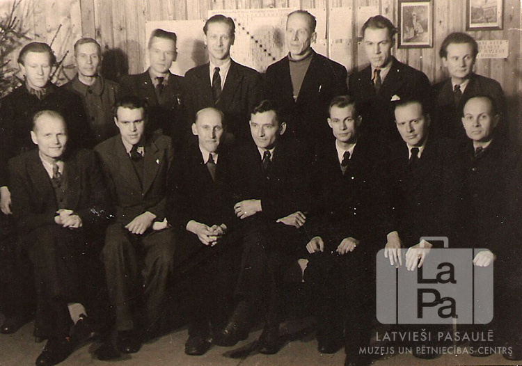 Vācijas angļu zonas latviešu šaha meistarības turnīra fināla dalībnieki Volterdingenē (angļu zonā). Turnīrs notika no 1946. gada 28. decembra līdz 1947. gada 5. janvārim. Vīrieši sēž divās rindās, kreisajā pusē redzami egļu zari. Fonā ir koka siena ar piestiprinātiem dokumentiem un attēliem. Priekšā sēž, no kreisās: Dr. J. Zemzaris (Šlezviga), Z. Bergmanis (turnīra vadītājs, Volterdingena), A. Dārznieks (Blomberga), Jānis Liepiņš (Volterdingene), K. Mūrnieks (turnīra vadītāja vietnieks, Volterdingene), A. Dārtavs (Oldenburga), A. Teters (Grossenbrode). Aizmugurē stāv, no kreisās: I. Konovaļenko (Zēdorfa), M. Homentovskis (Švarcenbeka), A. Liepnieks (Oldenburga), L. Mangalis (Neištate), A. Raņķis (Oldenburga), A. Līdacis (Lībeka), P. Purkalītis (Mērbeka).