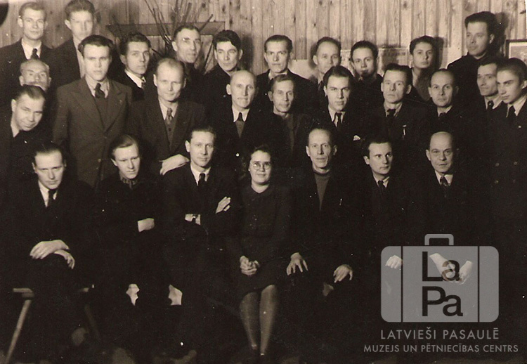 Vācijas angļu zonas latviešu šaha meistarības turnīra fināla dalībnieki Volterdingenē (angļu zonā) ar Volterdingenes šahistiem. Turnīrs notika no 1946. gada 28. decembra līdz 1947. gada 5. janvārim. Liela cilvēku grupa trijās rindās. Fonā koka dēļu siena.