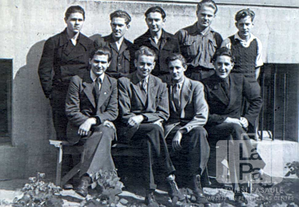 Latviešu ģimnāzijas 3. klases skolēni Hānavas nometnē (amerikāņu zonā) 1946. gada vasarā. Fonā ēkas siena. Pirmajā rindā, no kreisās: Laimonis Veibergs, Egons Baumanis, Bomifacijs Koncāns un Alans Bilens. Otrajā rindā, no kreisās: Jānis Ābeltiņš, Aleksandrs Zagorskis, Arvīds Lielkājs, Gunārs Beķeris un Alfreds Zivtiņš.