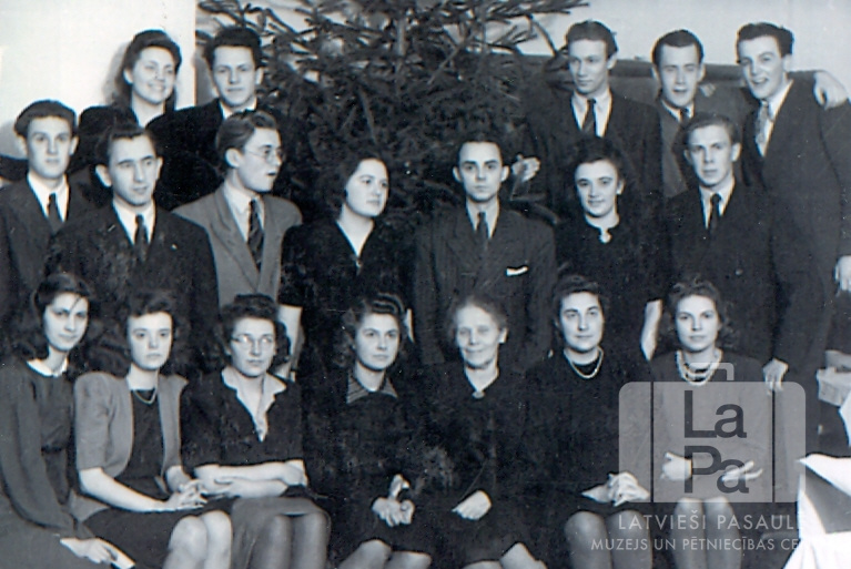 Ģimnāzijas 5. klases skolēni Ziemassvētku sarīkojumā Hānavas nometnē (amerikāņu zonā). Fonā egle. Pirmajā rindā sēž, no kreisās: Julieta Ogriņa, Austra Skudra, Ruta Kraule, Laimdota Kiršteine, Angelika Gailīte (klases audzinātāja), Gundega Jēgere un Maiga Liepiņa. Otrajā rindā stāv, no kreisās: Gunārs Sīmanis, Ilmārs Krasts, Ojārs Līģeris, Māra Karnupe, Jānis Lībietis, Helga Eņģele un Elmārs Mežgailis. Trešajā rindā stāv, no kreisās: Skaidrīte Kalniņa, Olģerts Grīnvalds, Ēriks Āva, Dzintars Cērps un Aivars Melderis. Par šo gadījumu Juris Krādziņš atceras: "Vienmēr nevar mācīties, kādreiz vajag arī papriecāties."