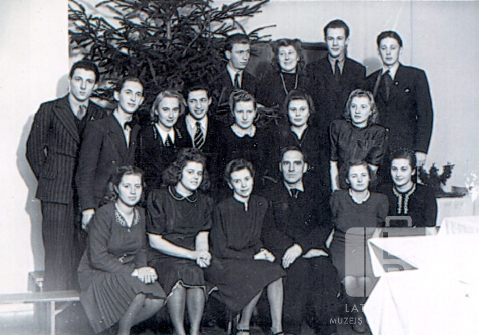Hānavas ģimnāzijas 4. klase skolēni ar skolotāju Ziemassvētku sarīkojumā Hānavas nometnē (amerikāņu zonā). Fonā egle. Pirmajā rindā sēž, no kreisās: Irēne Stepamova. Solveiga Kiršteine, Irma Ruļikova (klases audzinātāja), Ludvigs Vīks (skolotājs), Anda Rītiņa un Alīse Feldmane. Otrajā rindā, no kreisās: Ansis Dārziņš, Ervīns Rurkins, Rita Zeidaka, Dominiks Pontags, Anna Kapiņa, Irēne Ābola un Biruta Raituma. Trešajā rindā, no kreisās: Ilgvars Kleins, Gaida Liberte, Zigurds Pļaviņa un Gunārs Radziņš. Par šo gadījumu Juris Krādziņš atceras: "Vienmēr nevar mācīties, kādreiz vajag arī papriecāties."
