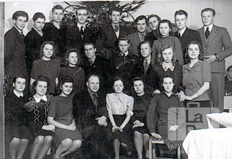 Hānavas ģimnāzijas 2. klases skolēni ar skolotāju Ziemassvētku sarīkojumā Hānavas nometnē (amerikāņu zonā). Fonā egle. Pirmajā rindā sēž, no kreisās: Rota Dāldere, Ērika Kalniņa, Irēne Zēberga, Fricis Gailītis (klases audzinātājs), Rasma Ruļikova, Skaidrīte Vītiņa un Vēsma Lonfelde. Otrajā rindā stāv, no kreisās: Ārija Audriņa, Mirdza Restberga, Sigurds Balodis, Ēriks Voitsa, Donalds Akmeņkalns, Biruta Kaufmane un Mirjama Krūmiņa. Trešāaj rindā stāv, no kreisās: nezināms, Aivars Keire, Kurts Hofmanis, Zigurds Pladars, ? Gedgovs, nezināms, nezināms, Ilze Viļuma, Alberts Zālfelds un Atis Vējiņš.