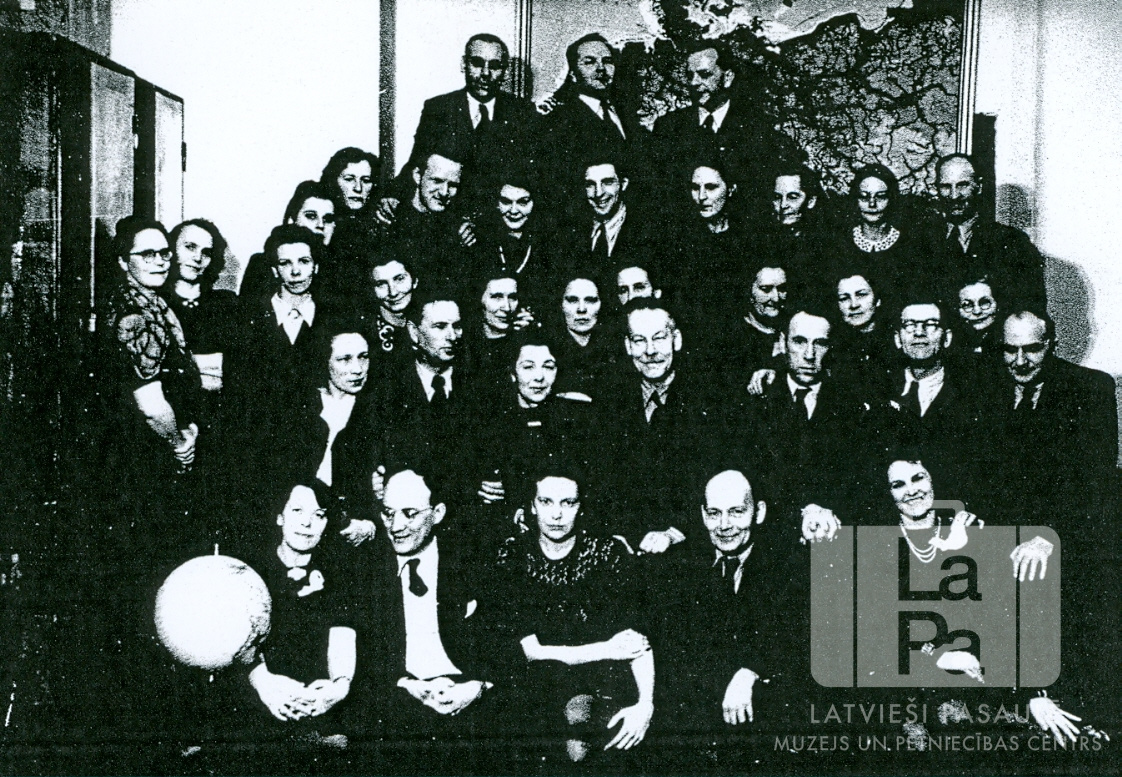 Latviešu skolu (pamatskolas un ģimnāzijas) skolotāju tuvināšanās vakars Hānavas nometnē (amerikāņu zonā). Liela skolotāju grupa 5 rindās. Kreisajā pusē skapis, pie aizmugurējās sienas ir Vācijas karte (?). Pirmajā rindā, no kreisās: Lūcija Vanaga, Georgs Blūms, nezināms, Pauls Everss un Staņislava Spruženiece. Otrajā rindā, no kreisās: Emīlija Krastiņa, Jēkabs Diebelis, Antonija Ozoliņa, Ernests Blese (ģimnāzijas direktors profesors), Valdemārs Mežraups, Haralds Grīns (pamatskolas pārzinis) un Vilhelms Grasmanis. Trešajā rindā, no kreisās: Lilija Puže, Irma Ruļikova, Elza Kalniņa, ? Zariņa, Antonijs Freibergs, Alīse Grāve, Emīlija Mežkalne, Elza Grīna un Milda Caune. Ceturtajā rindā, no kreisās: ? Vibele, Ārija Tilta, Austra Bišentropa, Arturs Langmanis, Silvija Āre, Eduards Sproģis, Vilma Šteinarte, Anna Cine, Tekla Kundziņa un Pēteris Rutkins. Piektajā rindā, no kreisās: Ernests Garumsons, Valdemārs Ruļikovs un Pauls Tīrums.