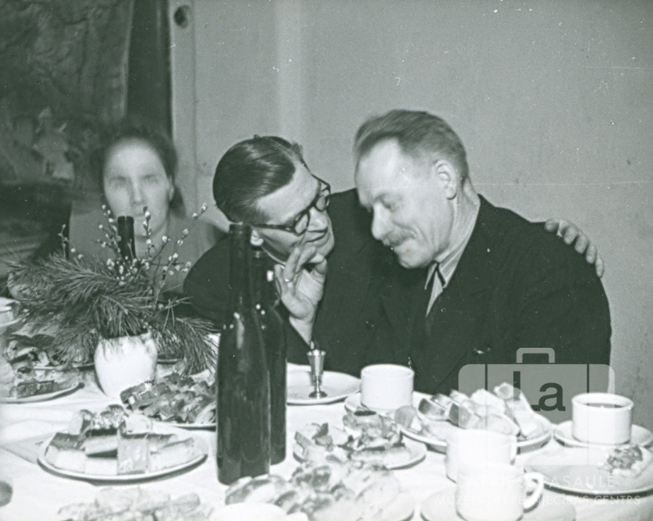 Pamatskolas pārzinis un ģimnāzijas direktors pārrunās pie viesību galda latviešu skolu (pamatskolas un ģimnāzijas) skolotāju tuvināšanās vakarā Hānavas nometnē (amerikāņu zonā). Uz galda ir trauki ar ēdienu, dzērienu pudeles un vāze ar pūpoliem un egļu zariem. No kreisās: nezināms, Haralds Grīns un Ernests Blese.