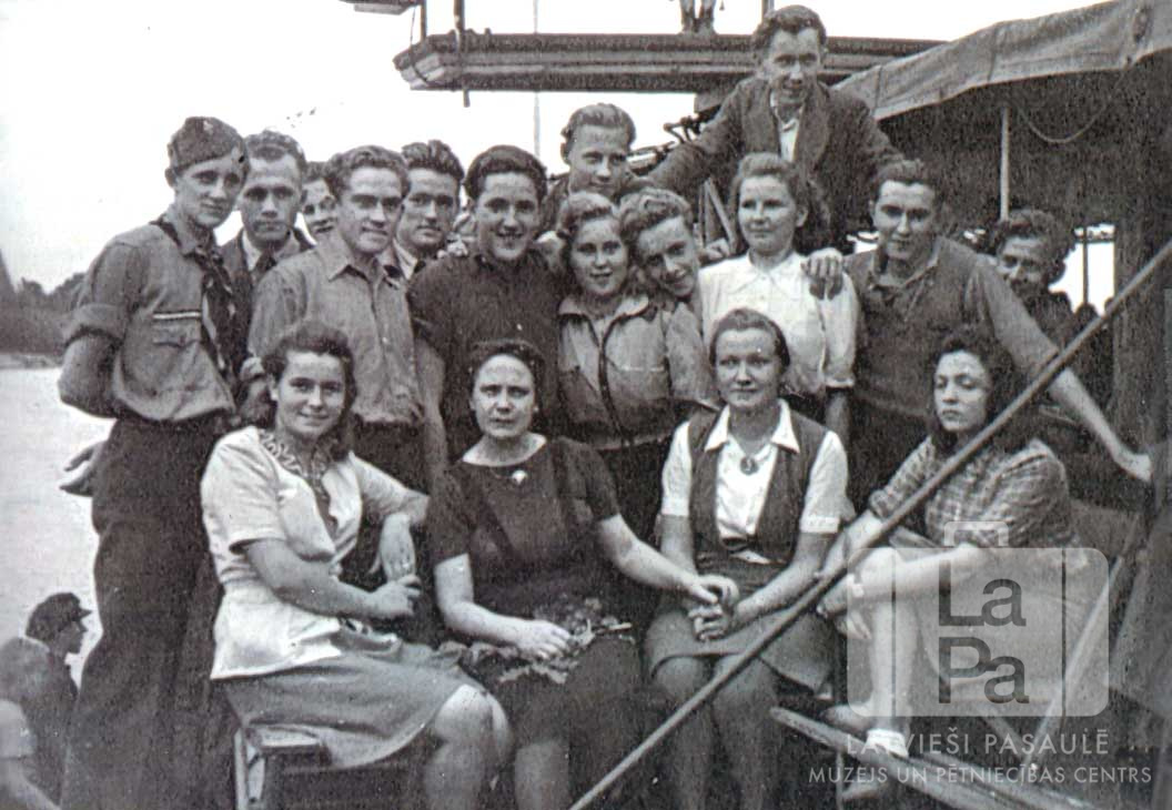 Latviešu ģimnāzijas 3. klases skolēni no Hānavas nometnes (amerikāņu zonā) uz neliela kuģa brauciena laikā pa Reinas upi. Priekšā sēž, no kreisās: Vija Ruble, Lilija Puže, Mirdza Zvaigzne un Maija Viļuma. Otrajā rindā stāv, no kreisās: Bonifacijs Kuncāns, Gēlijs Smilga, nezināms, Aleksandrs Zagorskis, Alberts Zālfelds, Alans Bilkens, Kira Obrazova, Egons Baumanis, Valija Ozoliņa, Arvīds Lielkājs un Alfreds Zitiņš. Trešajā rindā, no kreisās: Arnis Ziemelis un Ilmārs Krasts.