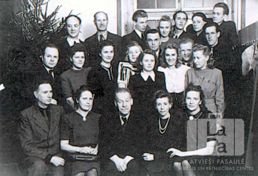 Latviešu ģimnāzijas 5. klases skolēni ar skolotājiem Ziemassvētku sarīkojumā Hānavas nometnē (amerikāņu zonā). Kreisajā pusē egle, fonā logs. Pirmajā rindā sēž, no kreisās: Jēkabs Diebelis, Lilija Puže, Ernests Blese (direktors), Irma Ruļikova un Elga Dūnis. Otrajā rindā stāv, no kreisās: Valdemārs Ruļikovs, Solveiga Kiršteina, Alise Feldmane, Biruta Rituma, Anda Rītiņa, Staņislava Spruženiece, Artūrs Langmanis un Anna Kapiņa. Trešajā rindā stāv, no kreisās: Georgs Blūms, Pēteris Rutkins, Ilgvars Kleins, Arturs Dūnis, Rita Zeidaka, Ervīns Rutkins, Gunārs Radziņš, Vitolds Diebelis un Zigurds Pļaviņa.