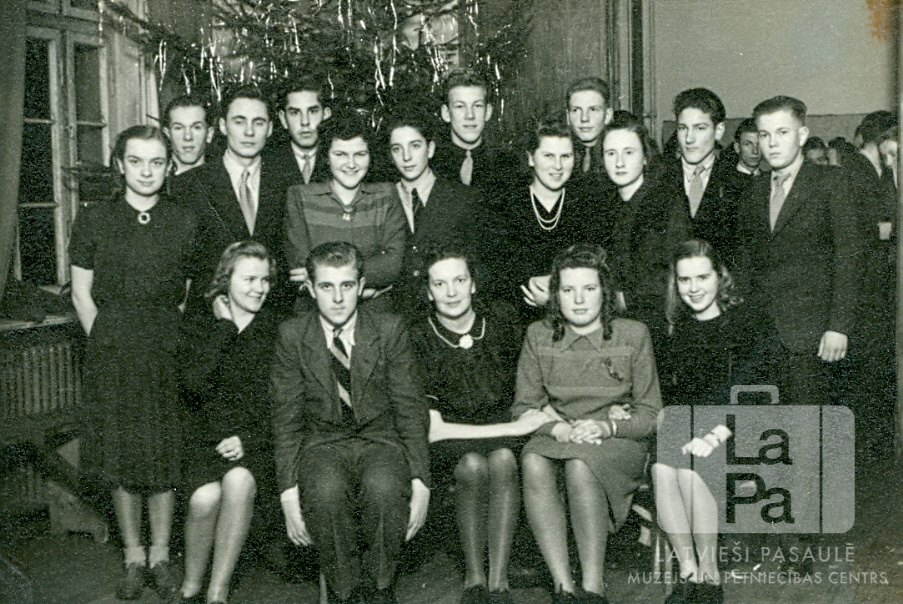 Latviešu ģimnāzijas 2. klases skolēni ar klases audzinātāju Ziemassvētku sarīkojumā Hānavas nometnē (amerikāņu zonā). Fonā egle un labajā pusē citi skolas audzēkņi. Pirmajā rindā sēž, no kreisās: Zigrīda Zeltiņa, Edmunds Preijs, Elga Dūnis (klases audzinātāja), Ausma Sprinceniece un Laimdota Sausā. Otrajā rindā stāv, no kreisās: Biruta Krastiņa, Uldis Bruniņš, Māra Bērziņa, Laimonis Embrekts, Ilga ?, Māra Heine, Edvīns Pļavnieks un Egons Riekstiņš. Trešajā rindā stāv, no kreisās: Evģēnijs Borisovs, Gunārs Liepiņš, Jānis Švalbe un Zigurds Krēsliņš.