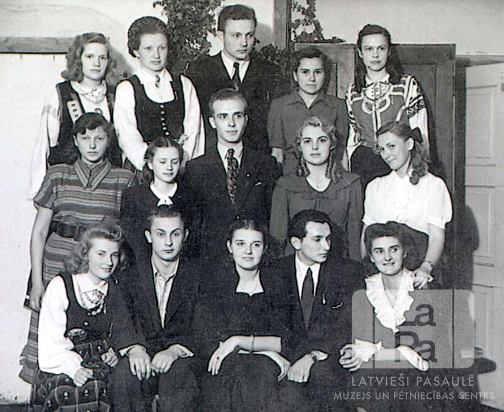 Latviešu ģimnāzijas 4. un 5. klases skolēni Hānavas nometnē (amerikāņu zonā). Vairākas meitenes ģērbušās tautastērpos. Fonā telpa ir izdekorēta ar koku zariem, telpas aizmugurē ir koka skapis un divas durvis. Pirmajā rindā sēž, no kreisās: Ilze Reščevska, Visvaldis Geidāns, Ārija Audriņa, Arvīds Lielkājs un Irēne Zēberga. Otrajā rindā stāv, no kreisās: Ilze Viļuma, Rasma Ruķikova, Zigurds Pladars, Mirjama Krūmiņa un Tabita Dubelzare. Trešajā rindā, no kreisās: Guna Štolcere, Mirdza Zvaigzne, Uldis Maksiņš un Biruta Biruma.