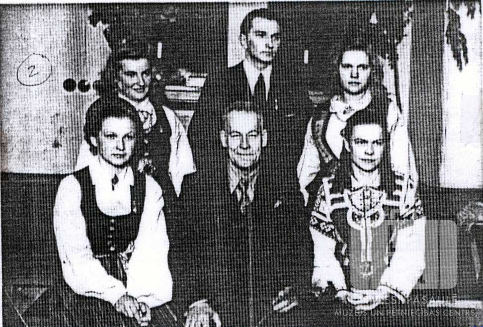 Latviešu ģimnāzijas pēdējā izlaiduma humanitārās klases abiturienti Hānavas nometnē (amerikāņu zonā). Četras sievietes ir ģērbušās tautastērpos, divi vīrieši ir uzvalkos. Pirmajā rindā sēž, no kreisās: Mirdza Zvaigzne, Ernests Blese (direktors) un Biruta Biruma. Otrajā rindā stāv, no kreisās: Ilze Reščevska, Arvīds Lielkājs un Guna Štolcere.