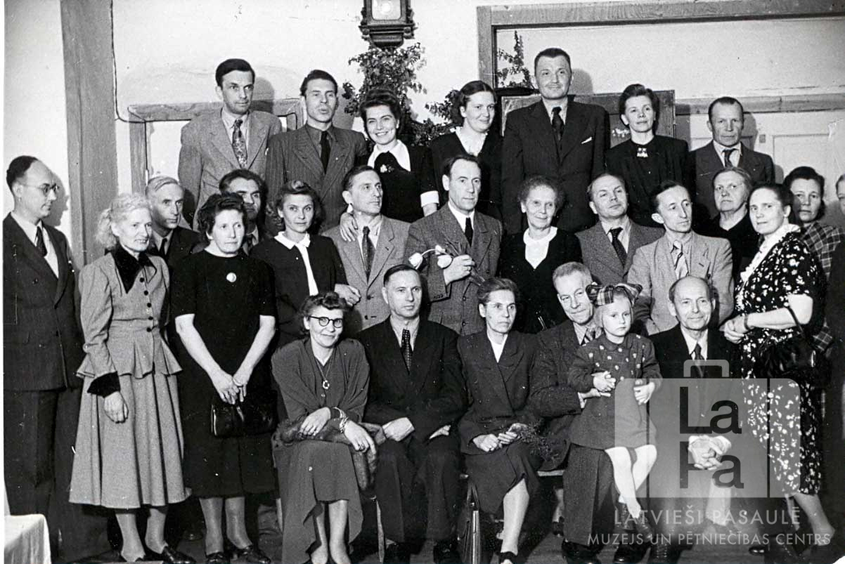 Latviešu ģimnāzijas pēdējā izlaiduma skolotāji un vecāki Hānavas nometnē (amerikāņu zonā). Fonā telpa ir izdekorēta ar koku zariem, telpas aizmugurē ir koka skapis un divas durvis. Pirmajā rindā sēž, no kreisās: Alma Audriņa, Jēkabs Diebelis, Ernests Bkese (ģimnāzijas direktors, profesors), nezināms un Pauls Everss. Otrajā rindā, no kreisās: Georgs Blūms, nezināms, Roberts Ankevics, nezināms, nezināms, ? Krūkliņa, Jānis Audriņš, Valdemārs Mežaraups, Angelika Gailīte, Valdemārs Ruļikovs, Pauls Kupčs, Herta Zvaigzne, Lilija Puže, Erna Ziemele un Erna Stakele. Trešajā rindā, no kreisās: Artūrs Dūnis, Alfreds Krūkliņš, Skaidrīte Feddera, Elga Dūnis, Roberts Ozols, Irma Ruļikova un Hugo Ziemelis.