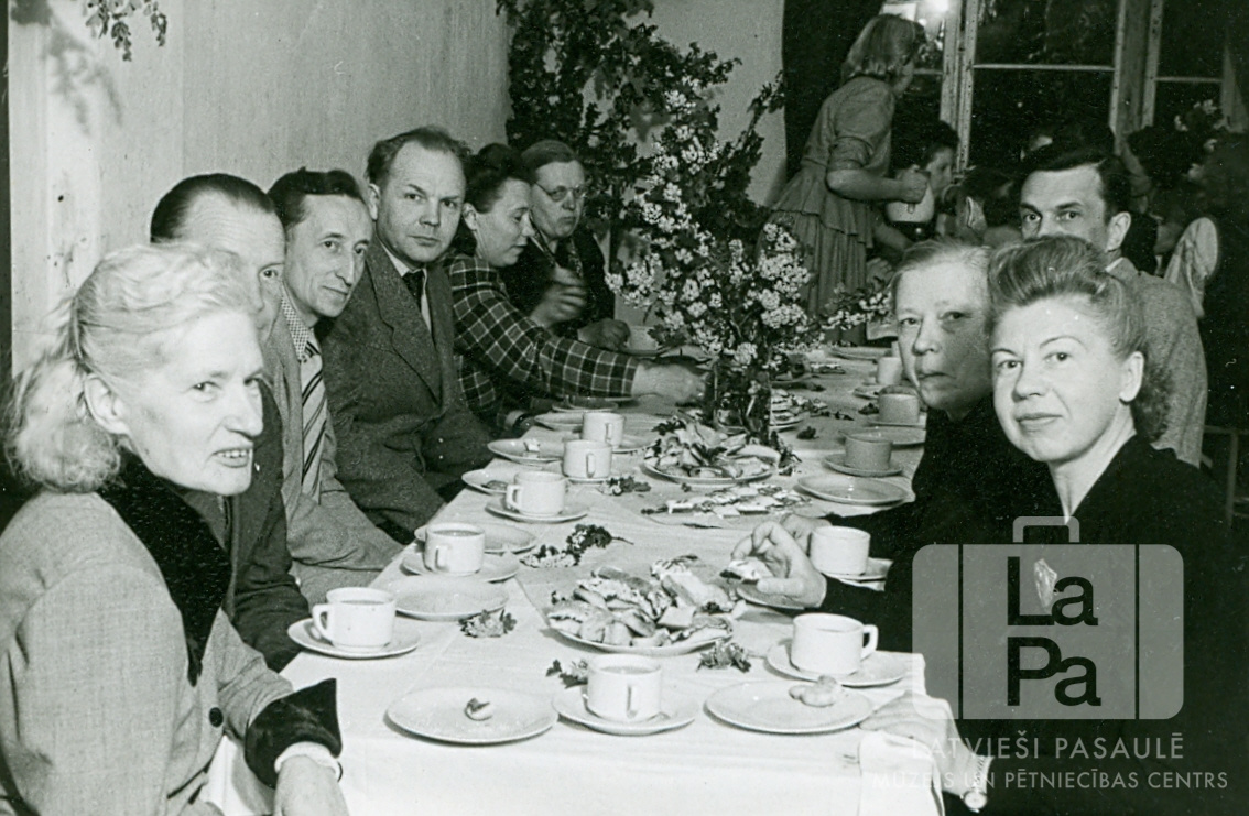 Latviešu ģimnāzijas pēdējā izlaiduma skolotāji un vecāki pie viesību galda Hānavas nometnē (amerikāņu zonā). Uz galda ir šķīvji ar ēdienu, trauki un vāze ar ziediem. Telpa ir dekorēta ar koku zariem. Telpas aizmugurē ir cits viesību galds un logs. Priekšplānā pie galda sēž, no kreisās: trešais Pauls Kupčs, ceturtais Valdemārs Ruļikovs, piektā Erne Ziemele, sestā Herta Zvaigzne. Galda labajā pusē sēž: trešais Arturs Dūnis.