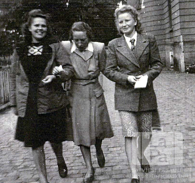 Trīs sievietes pastaigā pa bruģētu ielu Hānavas nometnē (amerikāņu zonā). Fonā, labajā pusē, vairākstāvu mūra ēka. No kreisās: Elvīra Sudmale, Emīlija Krastiņa (Hānavas ģimnāzijas meiteņu internāta vadītāja) un Dzidra Ozola.