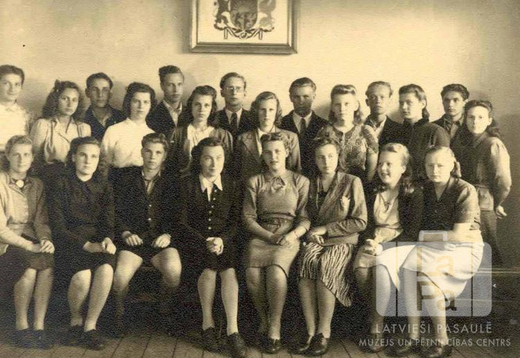 Kārļa Skalbes ģimnāzijas 2. klases skolēni un klases audzinātāja Antverpes nometnē Flensburgā (angļu zonā) 1948. gada pavasarī. Fonā uz sienas ir Latvijas valsts ģerbonis. Pirmā rinda sēž uz koka sola. Pirmajā rindā, no kreisās: otrā Inese Šulca, ceturtā ? Mežulis (klases audzinātāja), piektā Maija Noriņa, septītā Aina Poriete un astotā Austra Miķelsona. Otrajā rindā, no kreisās: otrā Ārija Buklovska, trešais Edvīns Hincenbergs, piektais Juris Orle, septītais Jānis Krūmiņš, astotais Ausma Rudzīte, desmitais Ruta Priedkalne un divpadsmitā Elza Grāvīte.